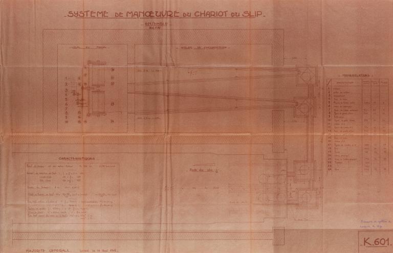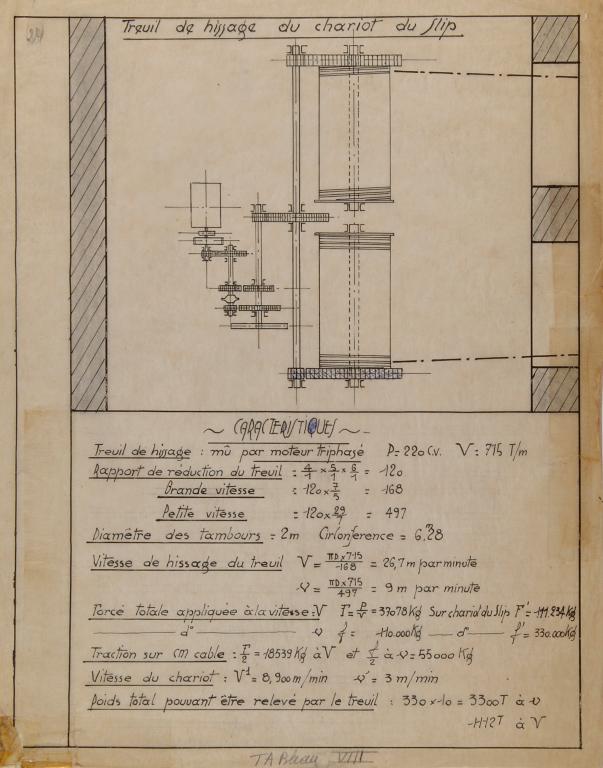Afin de permettre le passage optimum des deux câbles du chariot du slipway, les tambours du treuil sont implantés en-dessous du niveau du sol de la base. Les câbles passent par deux longues ouvertures, puis sous le sol de l’atelier de la chaudronnerie (dans deux gorges évasées) et sont renvoyés par un système de pouliage vers le charriot. Un escalier droit donne accès à la salle.