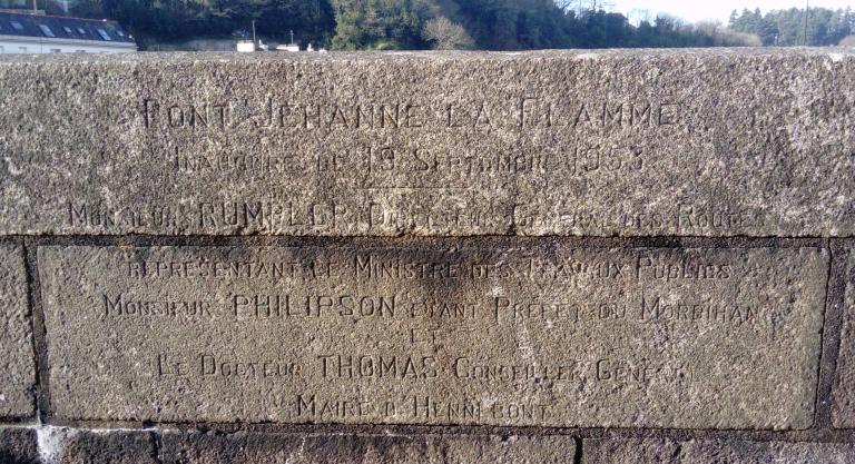 La ville d'Hennebont est née d'un point de franchissement sur le Blavet. Son nom même, "Hent pont" mentionné vers 1127 dans le Cartulaire de Sainte-Croix de Quimperlé, peut être traduit du breton par "route du pont". Construit entre 1949 et 1953, il est chronologiquement le 8e pont sur le Blavet à Hennebont. Comme l'attestent deux inscriptions, il est inauguré le 19 septembre 1953. La première mentionne la présence du maire et conseiller général, le Dr Thomas, de M. Rumpler, directeur général des router représentant le ministre des travaux publics, le Préfet, M. Gilbert Philipson ; la seconde précise les dates de constructions et les ingénieurs, MM. De Brun, ingénieur en chef du département, P. Bertin, ingénieur des ponts et chaussées et J. Druais ingénieur T.P.E. C'est l'entreprise Groleau de Vannes qui en a assuré la réalisation. MM. P. Le Galeze et H. Le Hay étaient les conducteurs de travaux.