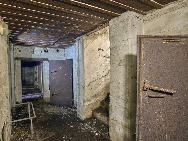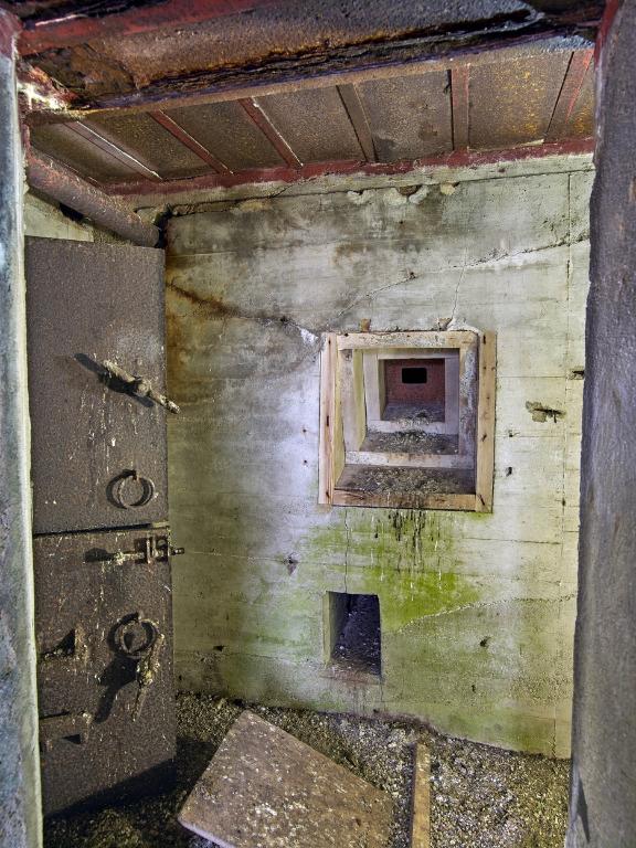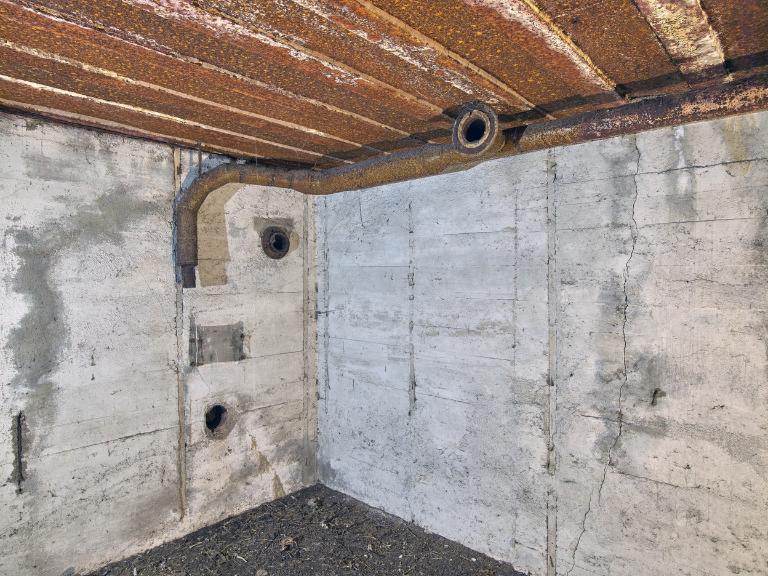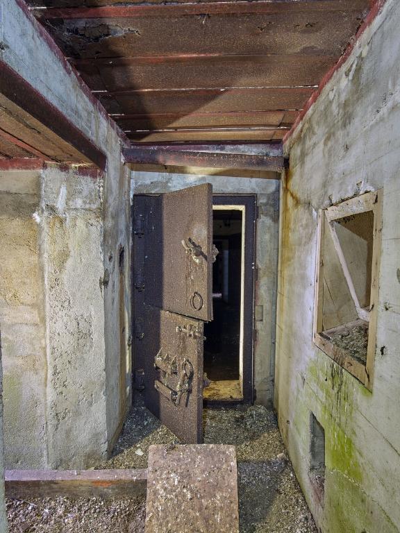 L'édifice regroupe un sas d’entrée, deux magasins de munitions (situés aux extrémités est et ouest), deux pièces de vie - chambrées pour les soldats et l’escalier desservant les cuves à canon implantées sur la dalle de couverture. Plusieurs portes sont en place : deux portes blindées à deux vantaux et deux portes étanches. Les huisseries et portes des deux magasins de munitions n’ont pas été mises en place. L’emplacement des ventilateurs [disparus] est bien visible. Les tuyaux de ventilation et des poêles sont en place. Une prise est visible dans le sas.