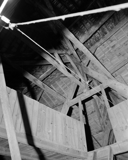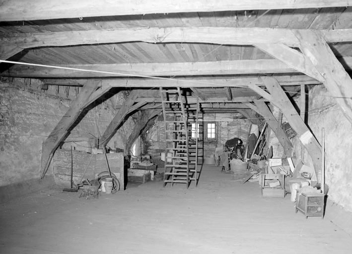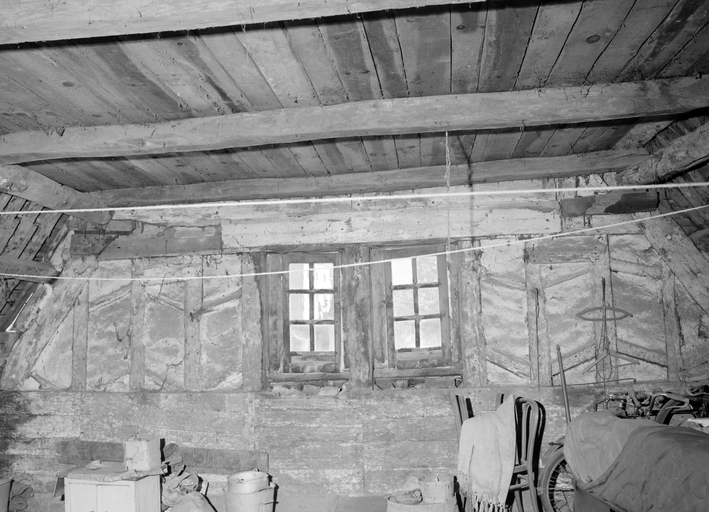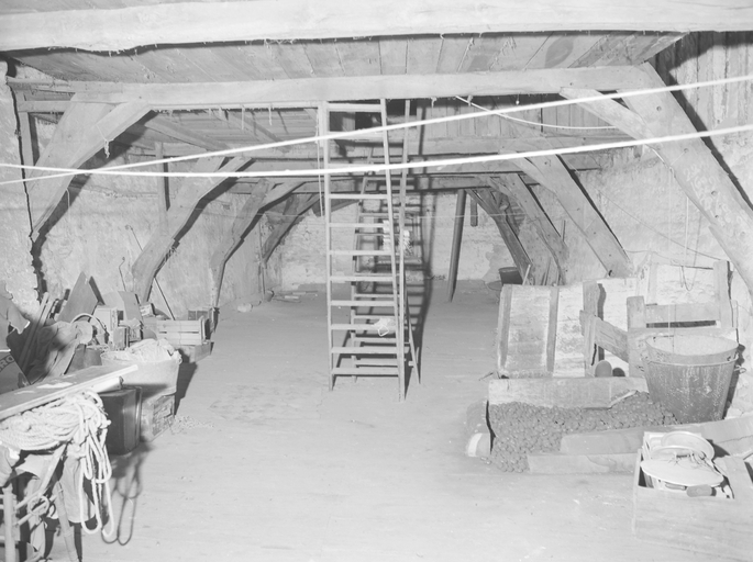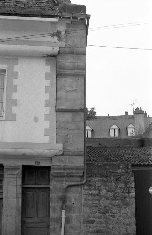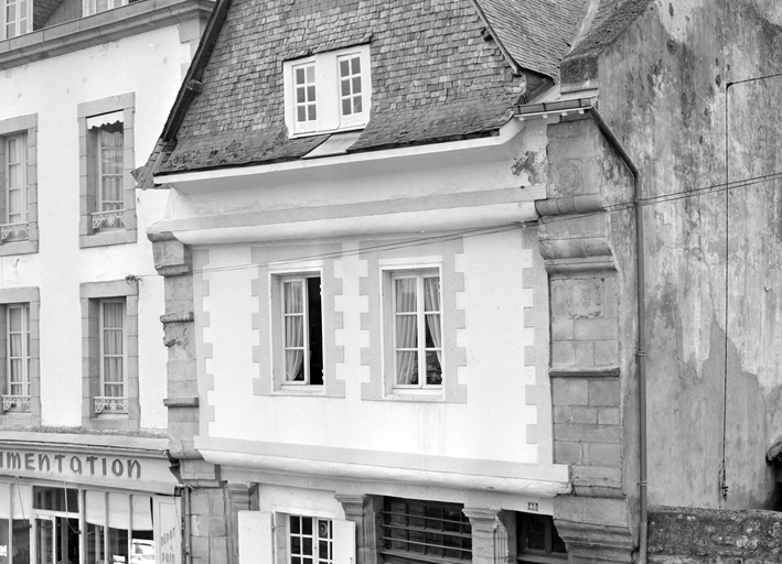 Des piliers en forme de pilastres divisent le rez-de-chaussée en trois travées : deux baies à vocation commerciale et la porte d'entrée à droite. Celle-ci ouvre sur un couloir séparé du commerce et qui donne accès à l'escalier à vis. L'étage et le surcroît sont construits en pan de bois en encorbellement et s'ancrent dans les murs gouttereaux. Les clichés de 1978 depuis les combles indiquent un pan de bois en chevrons, masqué à l'extérieur par un enduit. Le fenestrage actuel de l'étage ne correspond pas aux dispositions d'origine. Un essentage d'ardoises couvre les combles.