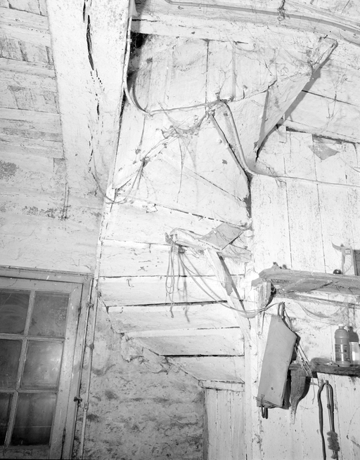 Des piliers en forme de pilastres divisent le rez-de-chaussée en trois travées : deux baies à vocation commerciale et la porte d'entrée à droite. Celle-ci ouvre sur un couloir séparé du commerce et qui donne accès à l'escalier à vis. L'étage et le surcroît sont construits en pan de bois en encorbellement et s'ancrent dans les murs gouttereaux. Les clichés de 1978 depuis les combles indiquent que un pan de bois en chevrons, masqué à l'extérieur par un enduit. Le fenestrage actuel de l'étage ne correspond pas aux dispositions d'origine. Un essentage d'ardoises couvre les combles.
