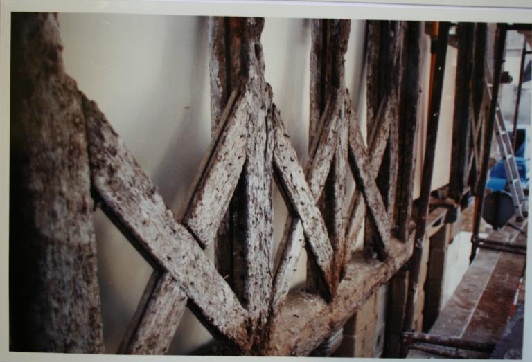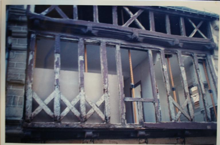 L'étage et le surcroît sont construits avec la technique du pan de bois en encorbellement sur solives, avec entretoises. Celles-ci sont chanfreinées avec congés et moulurées, selon des motifs différents entre les deux encorbellements. Les sablières de chambrée sont quant à elles finement chanfreinées entre chaque solive. La sablière de plancher conservée entre l'étage et le surcroît est elle aussi légèrement chanfreinée entre chaque poteau d'huisserie. Ceux-ci, au nombre de dix, divisent la façade en neuf travées égales dans lesquelles s'ouvraient de petites fenêtres. Les croix de Saint-André servent d'allège et un linteau filant délimite leur hauteur. Au-dessus, les impostes ont pu être ouvertes ou comblées. La restauration de 1997 ne restitue que quatre fenêtres sur les sept à neuf qui ont pu exister. Sur l'une des images de ce chantier, on distingue des rainures sur les poteaux d'huisserie, du côté intérieur, qui peuvent correspondre à d'ancien volets coulissants. Des bois de remplois s'observent dans le surcroît actuel ; quant au pignon, la forme de sa charpente en a été modifiée et une lucarne ajoutée.
