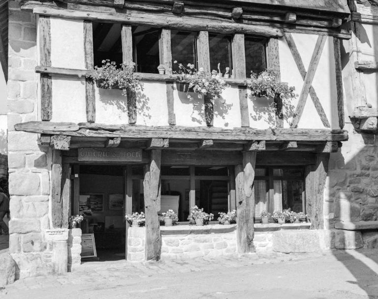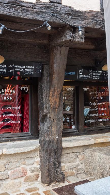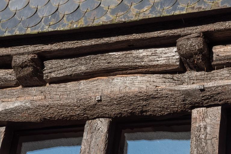 Quatre poteaux divisent le rez-de-chaussée commercial en trois ouvertures, une porte et deux vitrines. Les étals maçonnés sont de facture récente. Ces poteaux reçoivent la sablière de plancher, sur laquelle reposent les solives qui forment un encorbellement très profond. Des consoles renforcent l'assemblage entre les poteaux et les solives principales. L'espace créé par l'encorbellement est comblé par deux entretoises, simples pièces de bois quadrangulaires disposées en escalier. Le contreventement de l'étage se compose de poteaux et d'une croix de Saint-André à droite sur toute la hauteur du niveau. Six petites fenêtres sont dessinées par un appui et un linteau filant, donc cinq sont ouvertes. L'encorbellement des combles, avec entretoises, est peu profond.