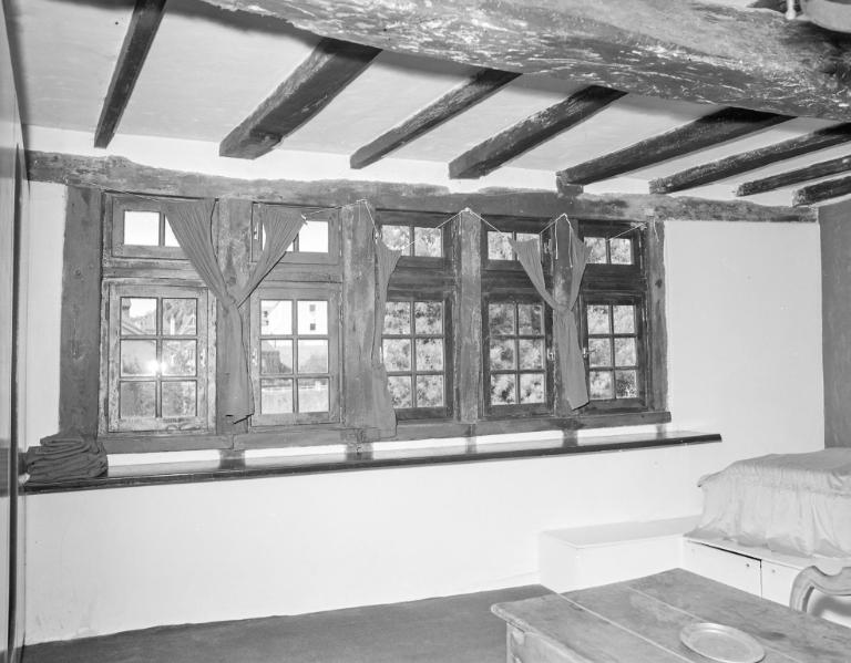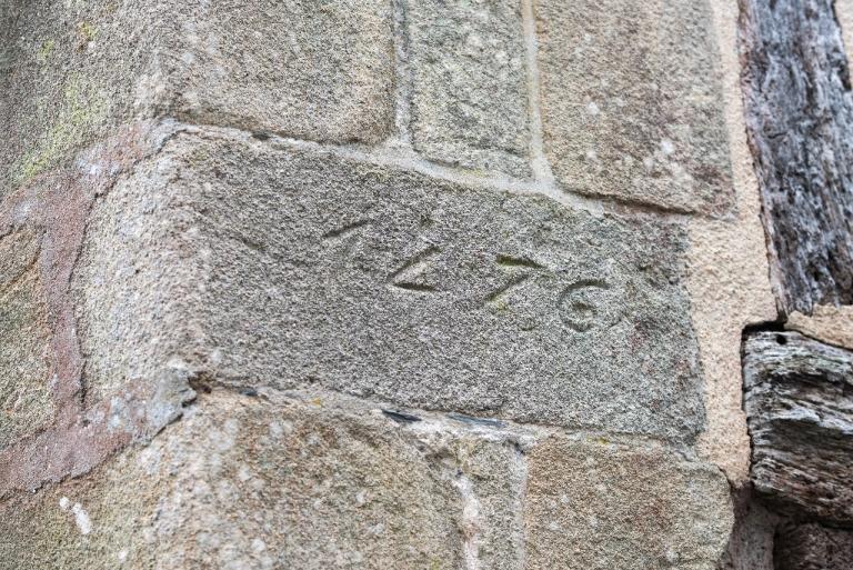 La pierre gravée de la date 1476 sur le mur gouttereau nord ne semble pas en remploi, mais l'inscription peut être ultérieure. L'encorbellement avec entretoises moulurées et les pigeâtres tronconiques évoquent une construction de la première moitié du 16e siècle. Les croix de Saint-André qui contreventent les extrémités sur toute la hauteur de l'étage sont compatibles avec une datation assez ancienne du bâtiment.