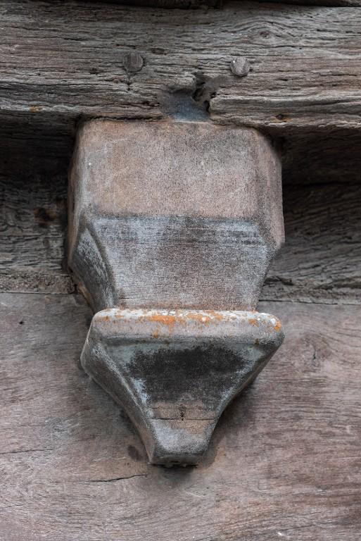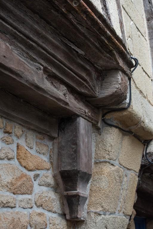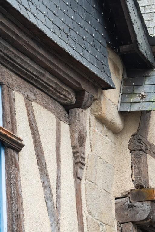 L’encorbellement de l’étage et du comble s’ancrent dans les murs gouttereaux à ressaut. Entretoises et sablières de chambrée sont chanfreinées et moulurées. Une claire-voie de cinq fenêtres avec appui et linteau filants assure l’éclairage. Deux croix de Saint-André contreventent les extrémités sur toute la hauteur du niveau. Des pigeâtres bagués, tous différents, renforcent la liaison entre les quatre abouts de solive et les poteaux. Un essentage d'ardoises masque le comble.