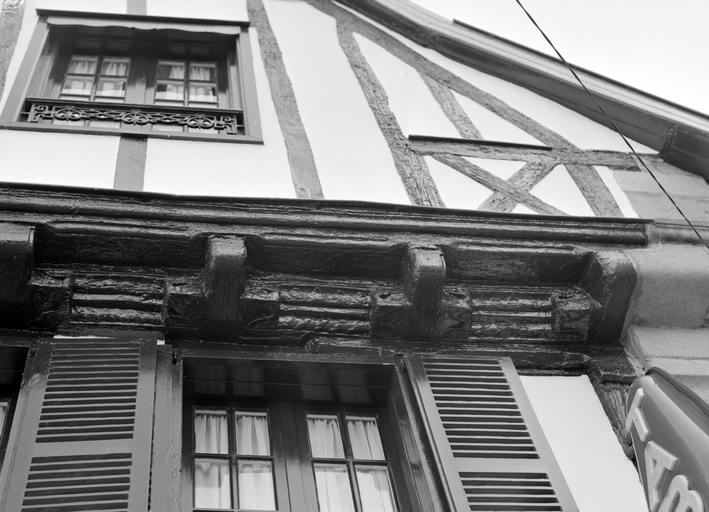 Etage et combles sont en pan de bois en encorbellement accompagné par les ressauts de la maçonnerie. Une lisse divise l'étage en deux et sert d'appui de fenêtre. L'alignement de croix de Saint-André en allèges suggère cinq anciennes travées, remplacées ultérieurement par les deux fenêtres de grand gabarit. Des volutes ornent les consoles des poteaux corniers et les entretoises comportent moulures et motifs géométriques ou végétaux.