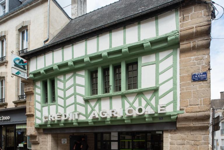La façade à gouttereau sur rue présente un premier étage et un surcroît en pan de bois en encorbellement ancrés dans des murs pignons à ressauts. Une lisse basse souligne l’appui de la galerie de fenêtres. Chevrons, potelets et croix de Saint-André contreventent et animent la façade. Le rez-de-chaussée est en partie repris et reculé par rapport à l'aplomb initial. Le pignon donnant sur la rue de Keriolet comporte un conduit de cheminée et une ouverture bouchée, probablement un ancien soupirail.