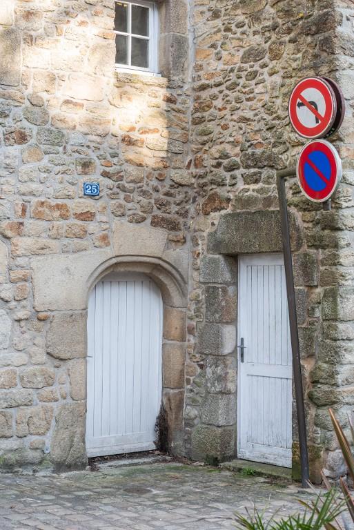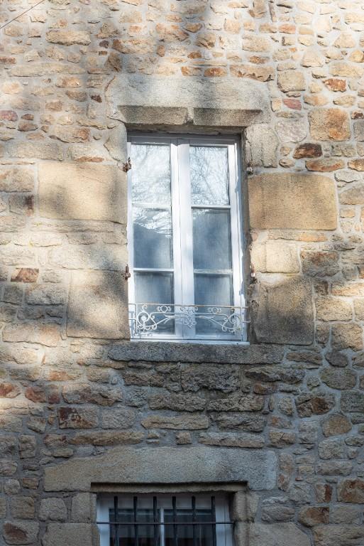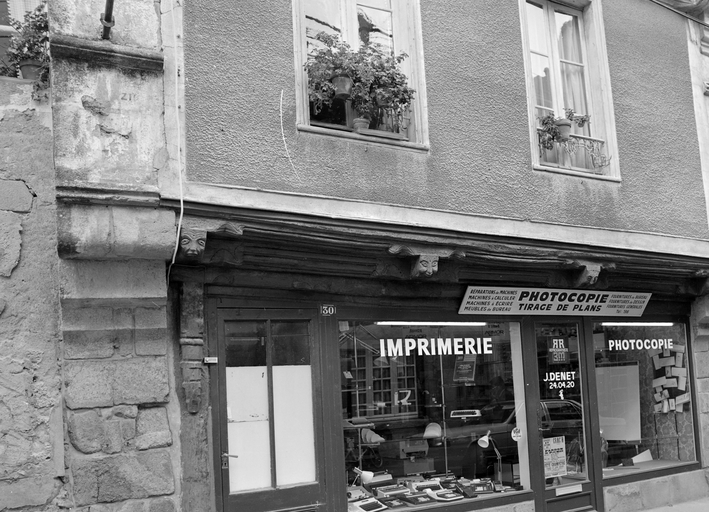 Place aux Roues, une porte en anse de panier moulurée donne accès à l'édifice. Ce même mur conserve au premier étage une fenêtre dont le meneau a disparu. Une construction postérieure masque le reste du gouttereau (n°50).