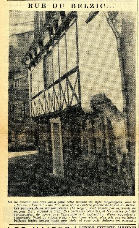 Un article du 26 avril 1961 paru dans la Liberté du Morbihan propose une photo de cette maison dite la "Maison à Casimir", avant remaniements. L’étage est divisé par une lisse filante sous laquelle des croix de Saint-André servent d’allèges. Des poteaux marquent l’emplacement des anciennes fenêtres. Le surcroît contreventé par des potelets disparaît ensuite au profit de combles couvertes par un toit à demi-croupe. Le pan de bois actuel, entièrement repris, se compose de poteaux et inclue deux grandes fenêtres.