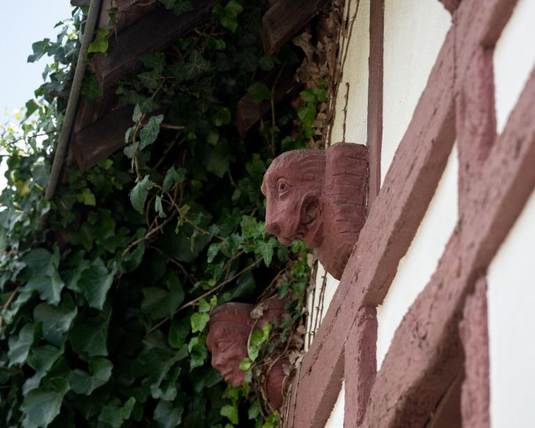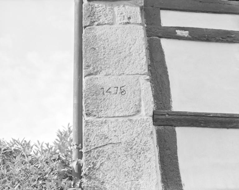 Le mur pignon de gauche porte la date de 1475, qui est à prendre avec précaution. Celui de droite présente un écu incluant deux outils, la hache et l'équerre, qui peuvent suggérer qu'un artisan charpentier en est le commanditaire. Le mur gouttereau sud comporte la cheminée : ses piédroits sont ornés d'un large chanfrein dont chaque extrémité est sculptée. Une porte, qui n'est pas d'origine, perce le pignon ouest et permet un accès direct à l'étage, ce qui laisse supposer une division de la maison à un moment donné. L'ouverture du rez-de-chaussée, au ras du sol, souligne l'exhaussement de celui-ci. Des remaniements ultérieurs ont conduit au percement de nouvelles ouvertures dans les murs sud et est.