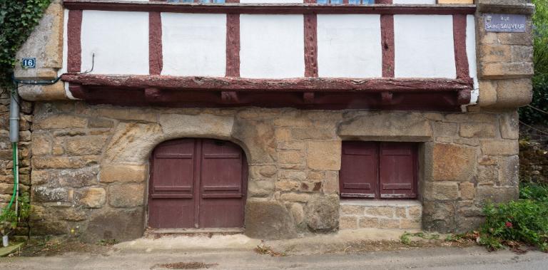 La façade rue Saint-Sauveur comprend un rez-de-chaussée maçonné avec une porte au linteau arrondi et une fenêtre partiellement murée, dont une partie se trouve sous le niveau de la voirie actuelle. L'étage est en pan de bois en encorbellement sur solives, accompagné par les ressauts de la maçonnerie, avec des entretoises simplement chanfreinées avec congés. Le contreventement se compose uniquement de poteaux qui divisent l'espace en cinq travées où s'ouvrent les fenêtres. Une lisse filante souligne leur appui. Une partie des bois a été remplacée. Un surcroît en encorbellement surmontait l'étage. Il n'en reste que les abouts de solives qui ont été sculptés de visages et d'animaux dans la première moitié du 20e siècle.