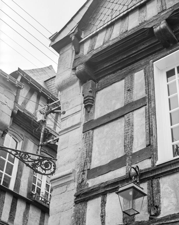 Cette maison d'angle possède un rez-de-chaussée sur poteaux de bois et mur-bahut, un étage carré et un étage sous combles en pan de bois. Elle est mitoyenne du n°21 avec laquelle elle partage un faitage et des similitudes dans le décor et la construction qui suggèrent une édification concomitante.