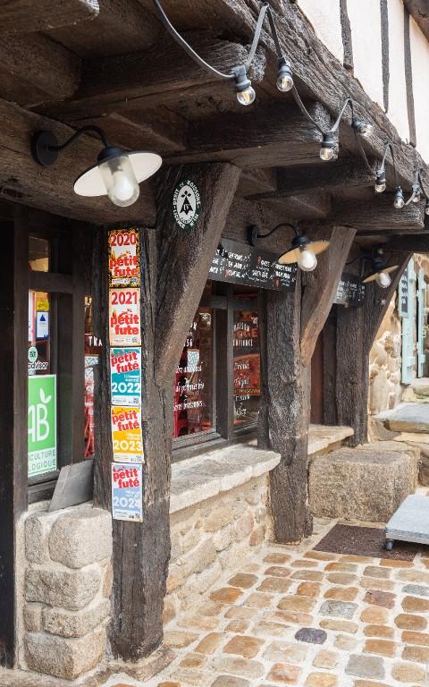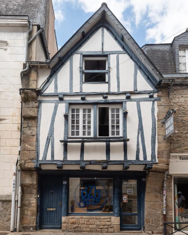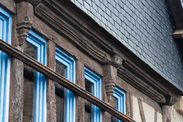 Des représentations de la rue Neuve signale deux maisons disparues à façades droites, dont l'étage repose sur deux sablières superposées (pas d'encorbellement ni d'éléments intercalaires visibles comme des abouts de solives). D'autres façades droites, en grande parties reprises, s'observent 6 rue Jean-Marie Barré et 14 rue Neuve. Des pastiches en faux pan de bois remplacent d'anciennes façades comme au 3 place de la République et au 51 rue du Petit Port. D'autres sont très reprises, avec une importante proportion de bois neufs : 21-23 rue du Petit Port, 1 place de la République, 13 rue au Lait...Le pan de bois du 13 rue du Belzic a même été évidé à l'étage, avec des fenêtres installées en retrait.