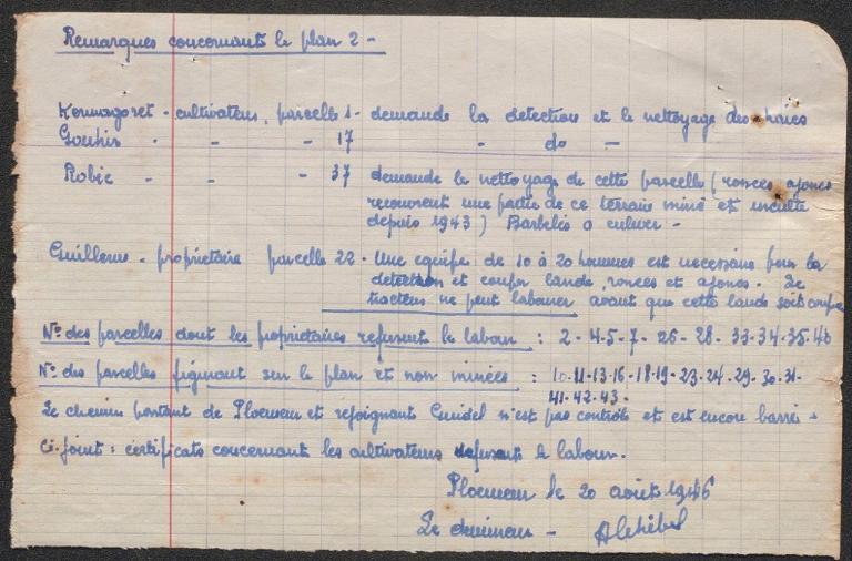 Sur 110,09 ha de superficie, 73,79 ha ont été passés au détecteur à métaux et nettoyés et 6,4 ha ont été "labourés" avec un tracteur Lanz Bulldog par le service départemental du déminage ; 29,9 ha a été "labourés" par les cultivateurs eux-mêmes qui engagent leur responsabilité en cas d’accident via des certificats. Comme d’autres cultivateurs, Joseph Robic de la ferme du Cosquéric refuse le concours du tracteur du service de déminage pour deux parcelles et rédige et signe un certificat le 12 août 1946. Il demande en revanche l’intervention du service de déminage pour le nettoyage d’une parcelle couverte de ronces, d’ajoncs et encombrés de barbelé, minée et inculte depuis 1943.