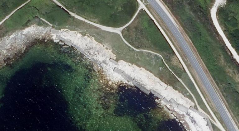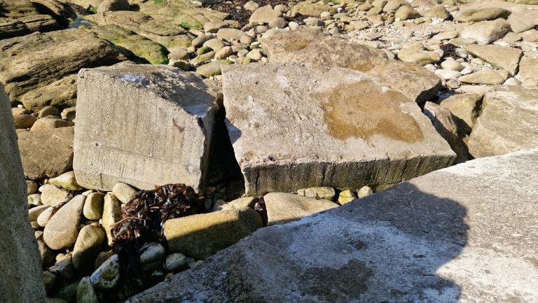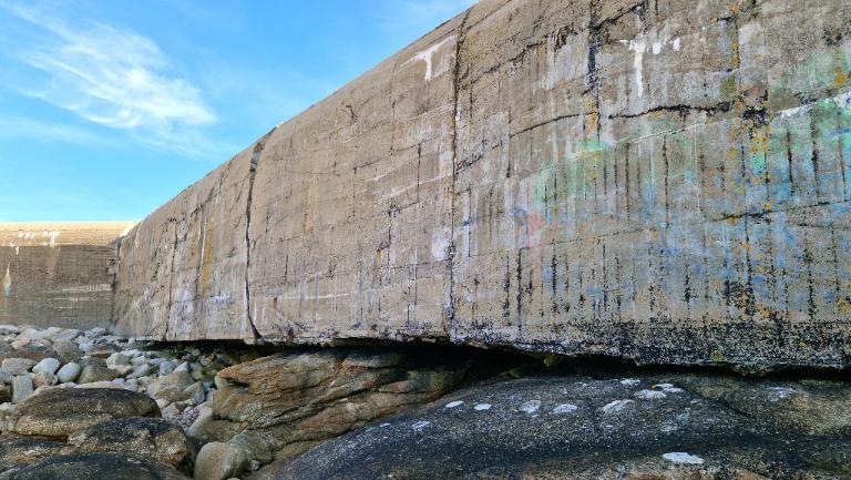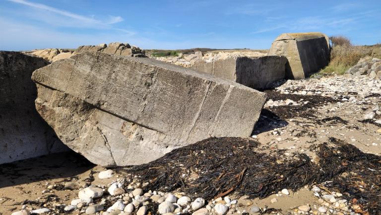 Du fait de l’érosion marine, des sections de mur d’inégales longueurs sont couchées sur la grève du côté de la mer. En certains points, ces sections se sont disloquées en éléments plus petits.