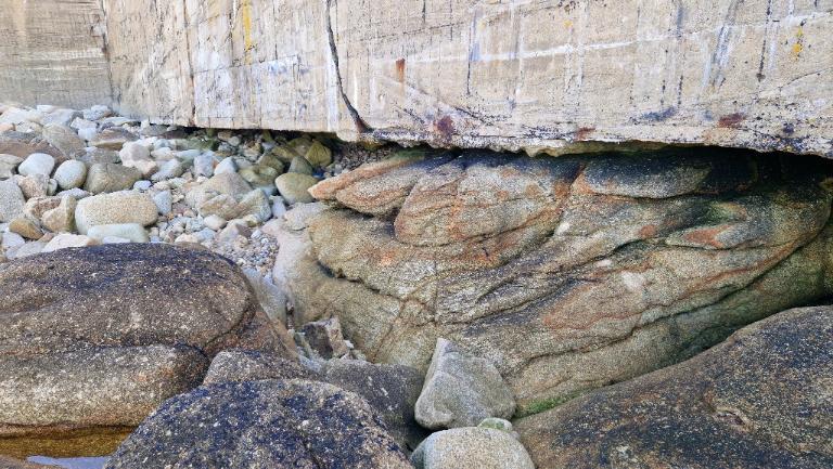 Au sud de la grève, le mur apparaît sapé, ne reposant que sur quelques appuis.
