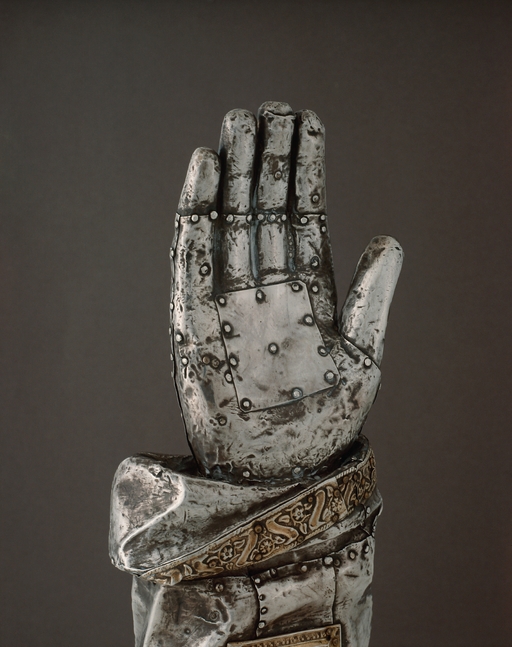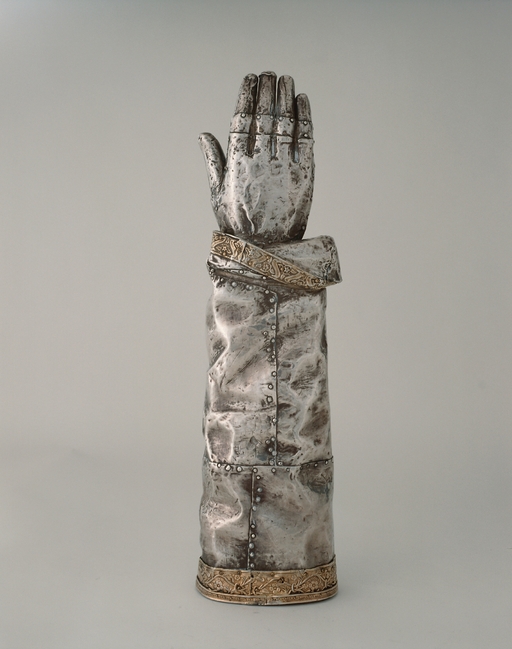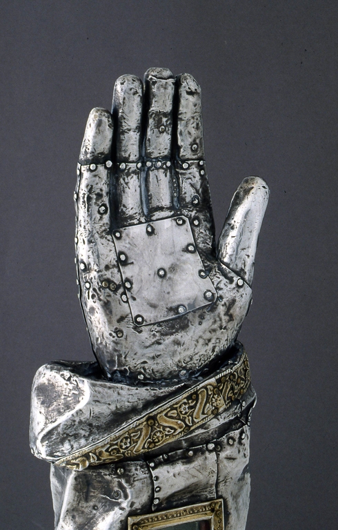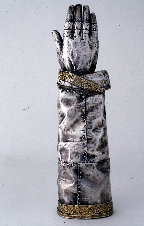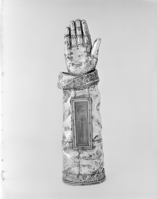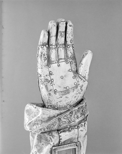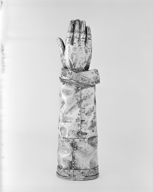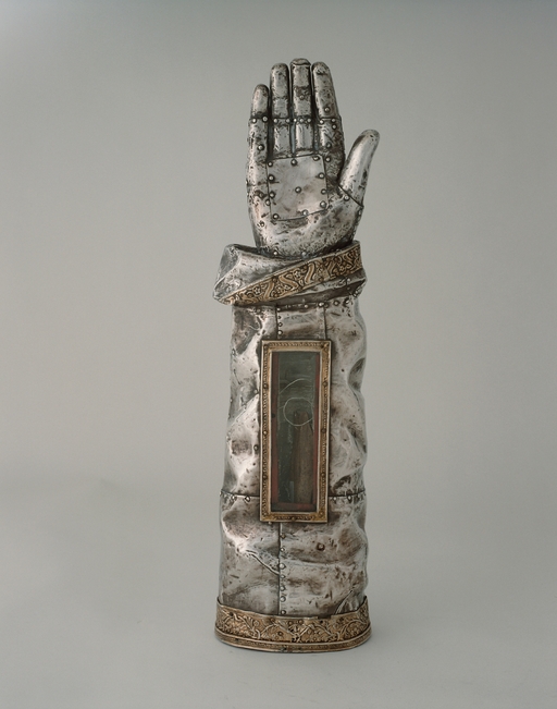 Niche reliquaire sur la face interne du bras. Argent découpé et clouté sur une âme de bois.