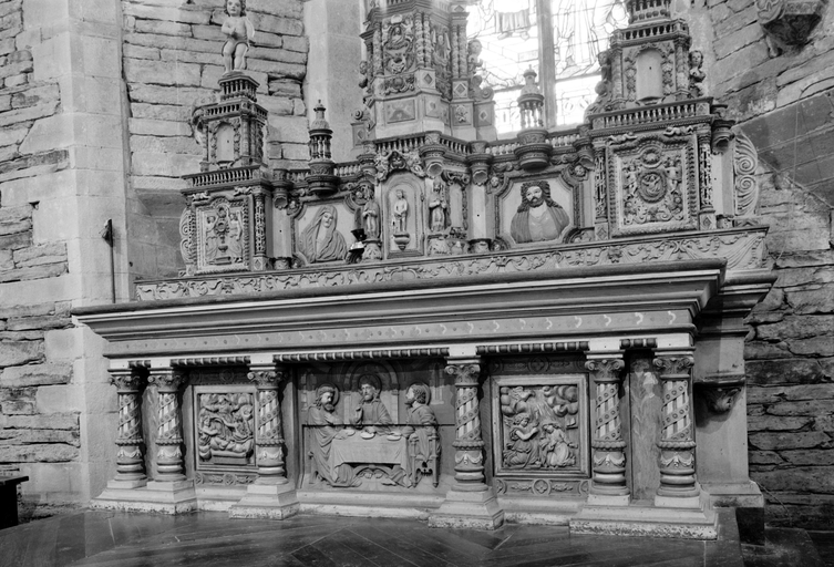 Ensemble composé d'un tabernacle de 1689 et d'un autel reconstitué en 1898 avec des panneaux du 4e quart du 17e siècle provenant de coffres anciennement situés de part et d'autre de l'ancien autel ; l'ancien autel en pierre de Kerlouet a servi à reconstruire la sacristie.