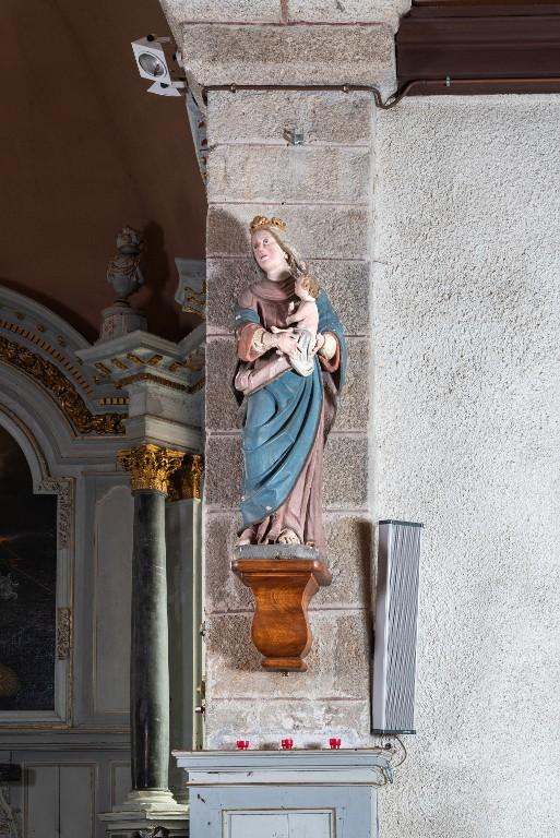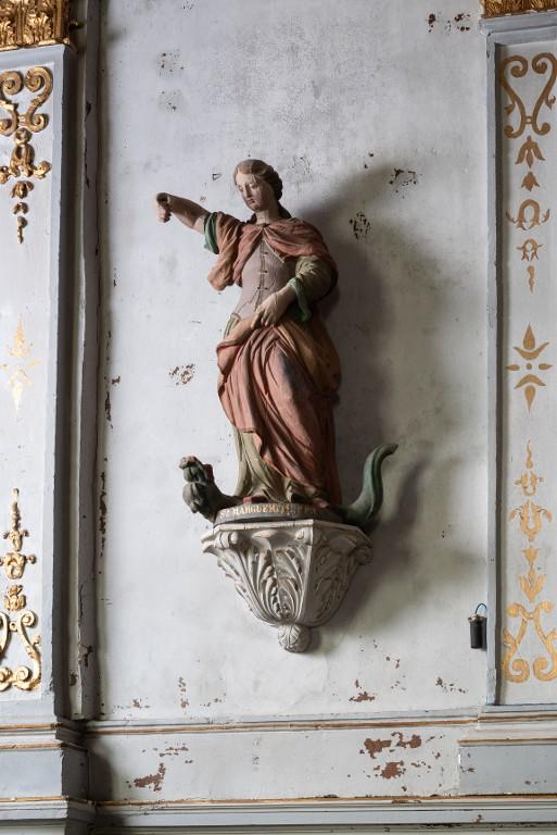 Les chantiers entrepris sur l’église paroissiale au cours du 18e siècle, s’accompagne d’un renouvellement du mobilier liturgique. Si les archives paroissiales ne mentionnent pas le retable et les lambris du choeur de l'église, le style Régence des sculptures, simple et élégant, permet de le dater du 1er quart du 18e siècle. Les autels latéraux, aujourd'hui disparus, dataient peut-être de la même période puisque le retable de la chapelle du Rosaire est "raccommodé" en 1763. Le choeur est orné d'un aigle-lutrin, construit dans la première moitié du 18e siècle et d'un ensemble de stalles construite au 19e siècle, pour remplacer des stalles construites en 1765. Plusieurs statues d'applique en bois, polychrome, datant du 18e siècle, décorent le choeur et la nef : sainte Marguerite, saint Antoine, saint Marc, Vierge à l'Enfant et le groupe sculptée de l'éducation de la Vierge.