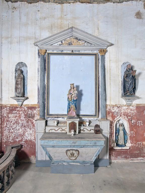 La chapelle présente deux autels retable en bois dans le transept, conçu dans le style du début du 19e siècle.