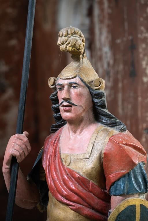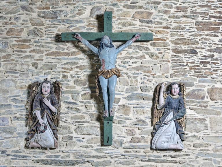 Sur le mur nord de la nef, un christ en croix est suspendu. Sa base possède des tenons et mortaises, ce qui laisse penser que cette sculpture en bois était à l’origine située sur une poutre de gloire.