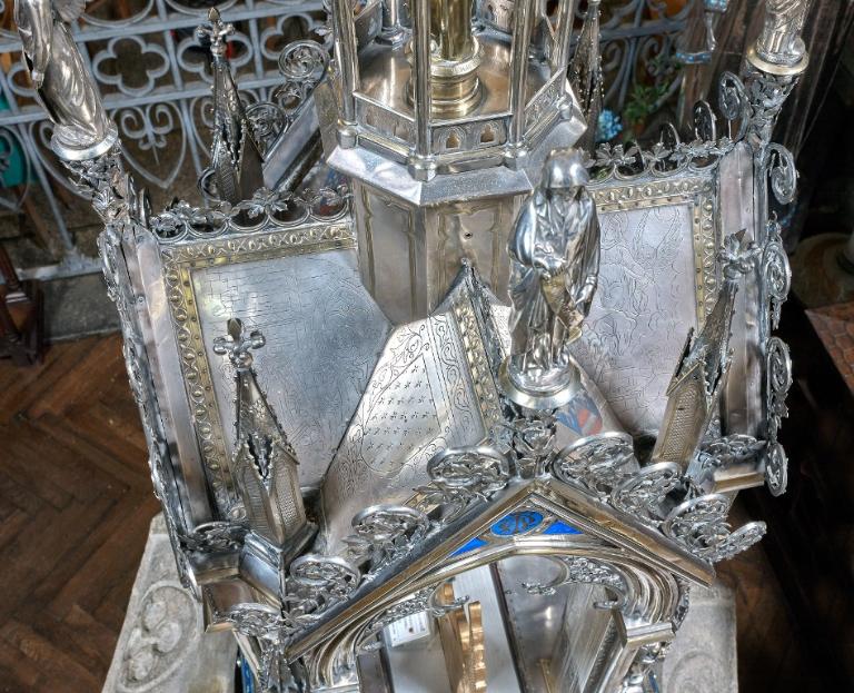 La partie intérieure du reliquaire, affectant la forme d'une tourelle portée par deux anges, a été volée en 1993 (cf illustrations : vue de l'objet prise en 1986, lors d'une précédente enquête d'Inventaire).