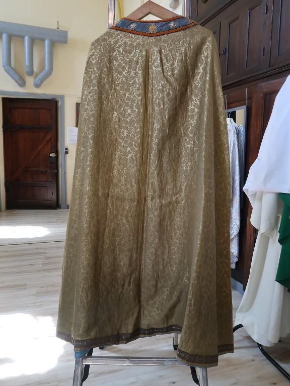 Manteau ou chape en satin damassé doré. Galons ornés de motifs végétaux de style Art Déco. Le col est en velours orné d'étoiles.