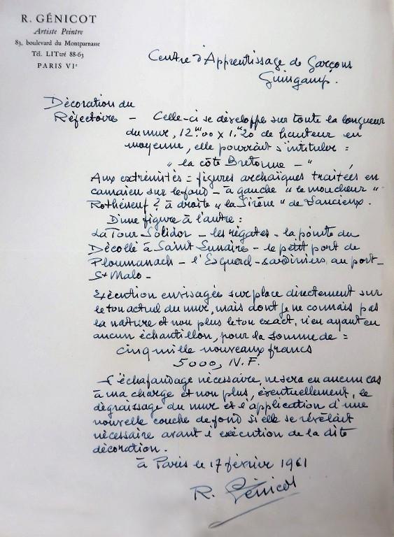 Le dossier du 1% artistique du Collège d’enseignement technique de Guingamp, conservé aux archives nationales, contient une description manuscrite de la main du peintre, rédigée le 17 février 1961 :