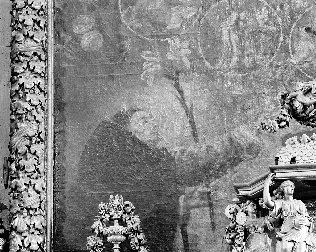 Médaillons du Rosaire occultés en partie dans la partie supérieure de la toile qui a une découpe semi-circulaire.