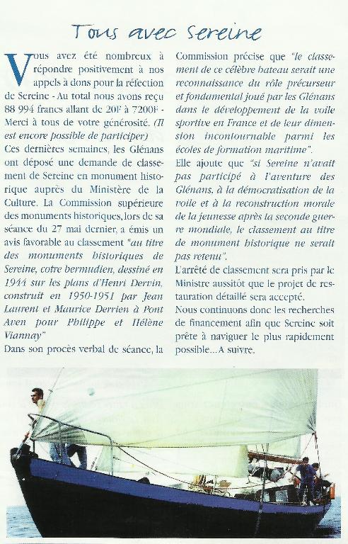 1999 : L’école de voile des Glénans fait un appel aux dons pour la réfection de Sereine et entreprend une démarche de classement au titre des Monuments Historiques. Une souscription est lancée.