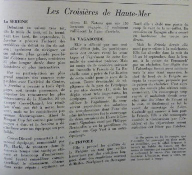 - Philippe Viannay, à l’origine de la création du Centre Nautique des Glénans, découvre dans le magazine Le Yacht des plans d’un voilier correspondant à son projet de navigation circumterrestre.
