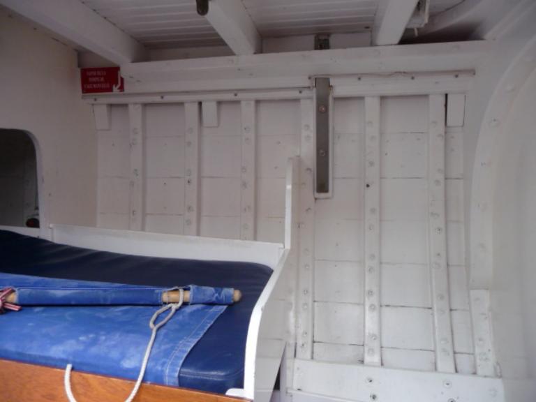 Une plaque en cuivre mentionnant le classement au titre des Monuments Historiques est fixée sur le voilier.