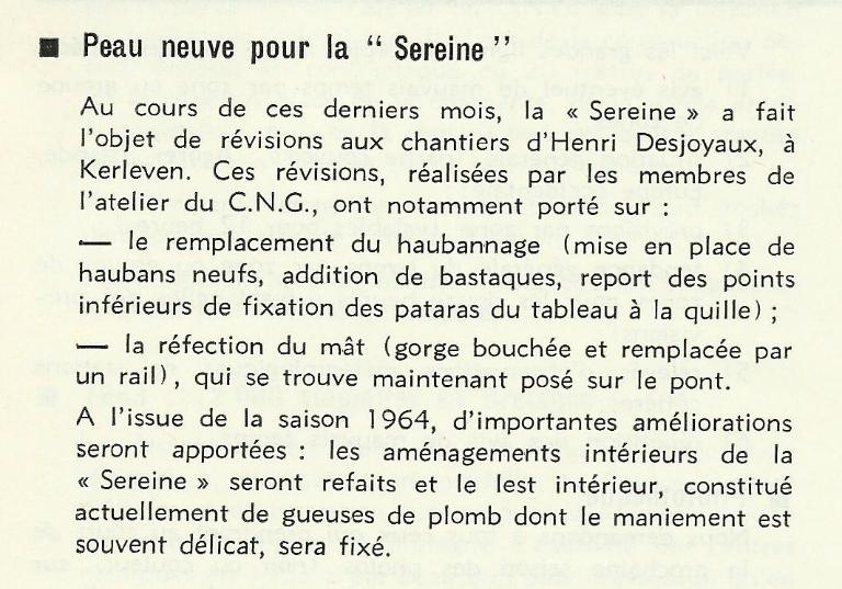 L'architecte de Sereine, Henri Dervin, a construit d'autres bateaux mythiques comme "Les 4 vents" de Marcel Bardiaux et "Kurun" de J.-Y. Le Toumelin classé en 1993.
