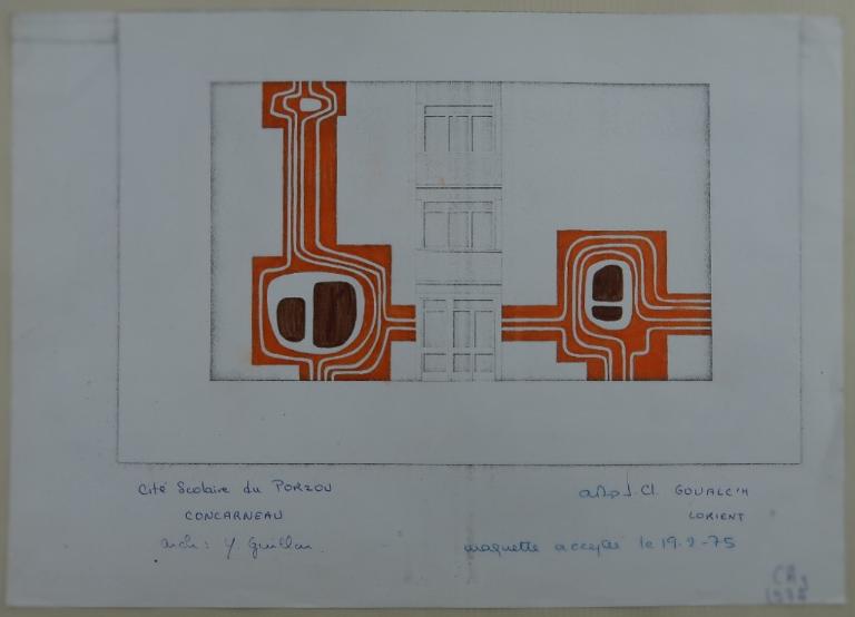 Dans le "dossier technique" de présentation de la décoration au titre du 1% artistique du "Lycée et collège d'enseignement technique" du Porzou, à Concarneau, daté du 3 mai 1974, l'architecte Yves Guillou présente l’œuvre comme suit :