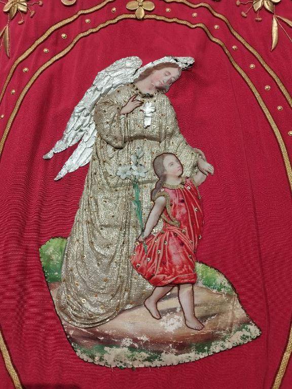 Cette bannière de procession était portée autrefois lors des Fête-Dieu. Elle ne l'est plus depuis une cinquantaine d'années. Elle est conservée dans l'armoire avec les vêtements liturgiques.