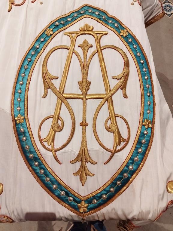 Il s'agit d'une bannière de petites dimensions, sans doute destinée aux enfants (jeunes filles). Elle porte d'un côté la représentation de la Vierge de l'Immaculée Conception et de l'autre les lettres A et M entrelacées ("Avec Maria").