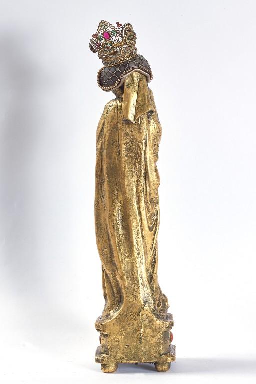 Les sources nous manquent pour établir la datation de la statue originelle, dont certaines parties composeraient celle que l'on voit aujourd'hui. En 1907, l'abbé Renault rapporte deux versions concurrentes du récit de l'invention de la statue, l’une relevant de la tradition populaire, l’autre de la tradition paroissiale. Selon la tradition populaire, des religieuses nommées "ermites", vivaient dans ce lieu vers le 16e siècle. L'une d'elles aurait sculpté une statue pour remercier ceux ayant continué à croire en la Vierge dans un contexte de guerres de religion : selon le récit oral d'une personne rencontrée sur place. L'une de ces ermites, seule ayant survécu aux guerres de religions, passait ses jours à prier et à confier ses peines à une statue. À sa mort, son logis s'écroula et on retrouva sous les débris, à côté d'une fontaine, une statue de la Vierge. Plusieurs personnes continuèrent alors à venir prier la statue qui fut abritée sous une grotte en forme de four. C'est ce premier oratoire qui accueille la statue, qui fut ensuite installée dans un plus grand oratoire au début du 19e siècle, puis dans une chapelle à partir de 1840, et enfin dans l'édifice que l'on connait aujourd'hui.