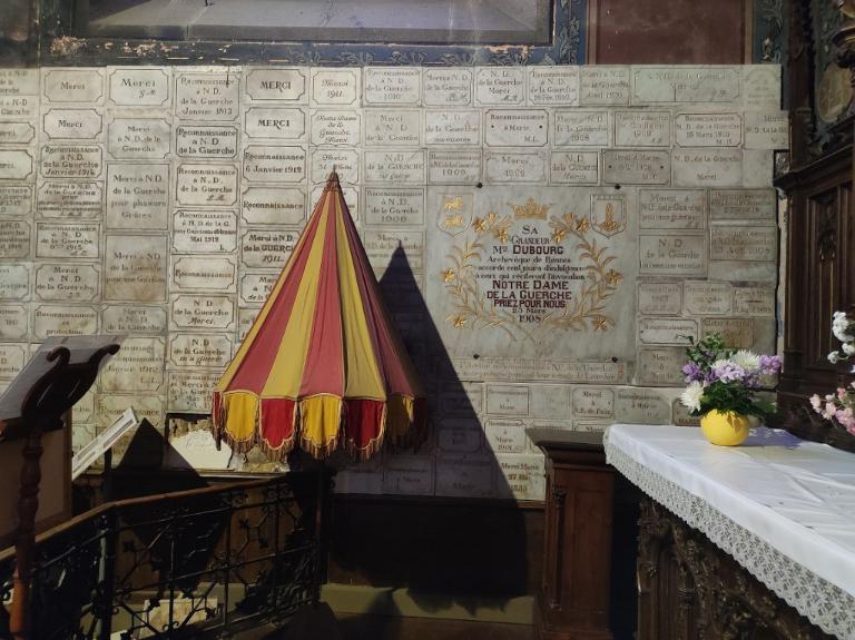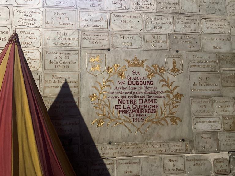 Le mur nord de la chapelle de la Vierge est couvert de plaques d'ex-voto en marbre remerciant Notre-Dame de la Guerche. Ils témoignent de l'intensité de son culte à la fin du 19e siècle et au début du 20e siècle. Le plus ancien date de 1885, mais la plupart ont été apposés durant le premier quart du 20e siècle.