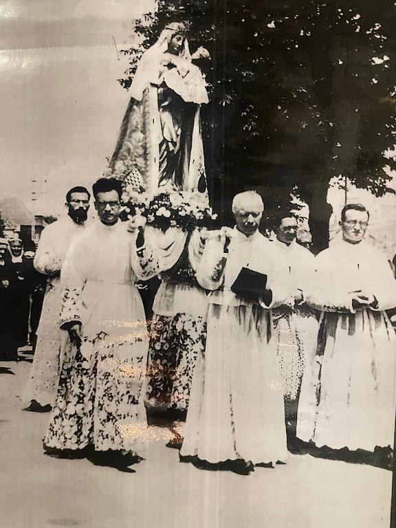 Les costumes de pages sont modernes (fin 20e ou début 21e siècle?) mais la pratique de faire accompagner la statue de la Vierge par des enfants est attestée déjà lors du couronnement solennel (1937).
