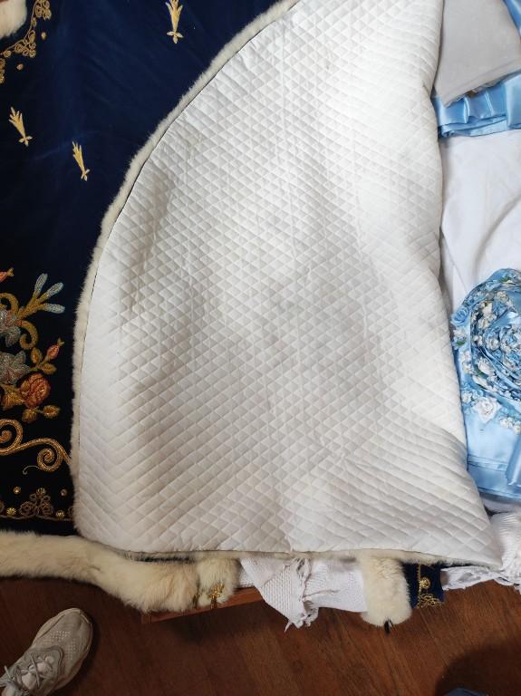 Ce manteau est en velours bleu bordé d'une fourrure d'hermine ou fausse fourrure. Il est orné sur les coins inférieurs d'une mandorle comportant les initiales A et M (pour Ave Maria) surmontée d'une fleur de lys, et environnée de broderies florales. Des fils métalliques dorés parcourent toute la bordure du manteau. Des hermines sont également brodées dans le dos. L'intérieur est matelassé.