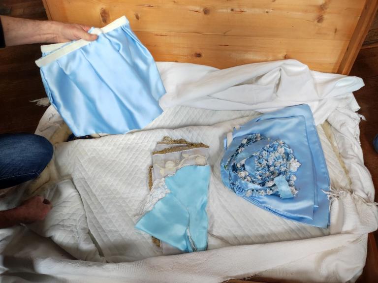 Dans la même boîte sont également conservés une tunique bleue destinée à habiller le Christ tenu dans les bras de la Vierge et des habits de page.