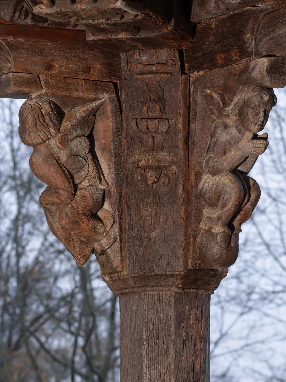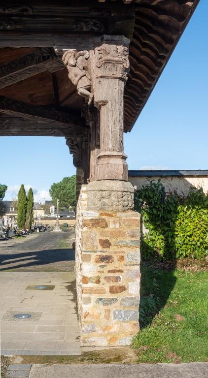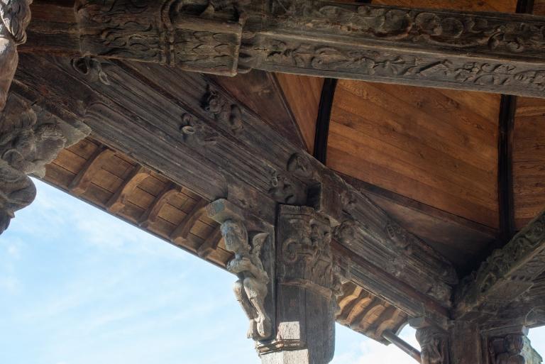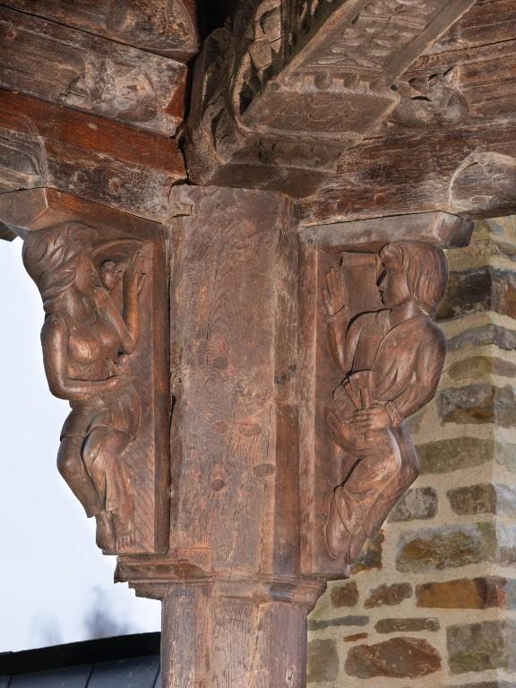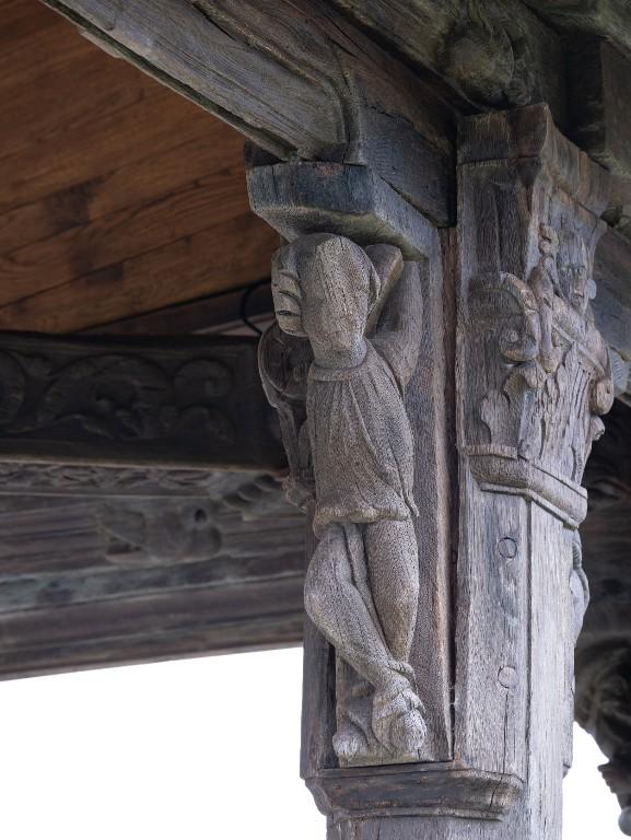 De forme carrée, ce porche repose sur de courts piliers de bois au nombre de trois par faces latérales. Des bases en pierre sculptée reçoivent les poteaux d'entrée, le tout s'appuyant sur un mur-bahut. Les poteaux soutiennent un système à sablière haute, entretoises et sablière basse. Deux entraits entièrement sculptés assurent la triangulation en se croisant et en rejoignant les poteaux corniers. Le décor se compose d'engoulants, de motifs végétaux, d'un bestiaire fantastique et de figures humaines qui se développent sur les sablières et entretoises. De chaque côté des poteaux, sculptés avec bases et chapiteaux ornés de divers motifs (moulures, visages, épée...), se trouvent des aisseliers qui renforcent l'assemblage avec les sablières. Ces pièces de bois sont sculptées en forme d'anges, de musicien, de sirène...