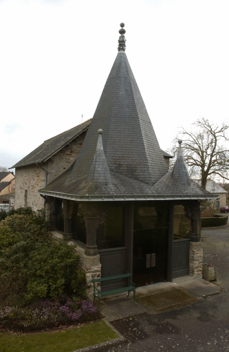 Daté du 16e siècle, ce porche se situait initialement sur la face sud de l'ancienne église paroissiale. Muni de bancs de pierre, il servait de lieu de réunion aux notables réglant les affaires de la paroisse. En 1890, il est menacé par les travaux de reconstruction de l'église. C'est alors que le chanoine Thébault l'achète, le démonte et le replace dans l'enceinte de son domaine aux Alleux. Il le place à l'entrée de la chapelle Notre-Dame-de-Lorette édifiée près de l'hospice qu'il vient de fonder. Bâtie en 1894, elle reprend le modèle du sanctuaire de Lorette en Italie.