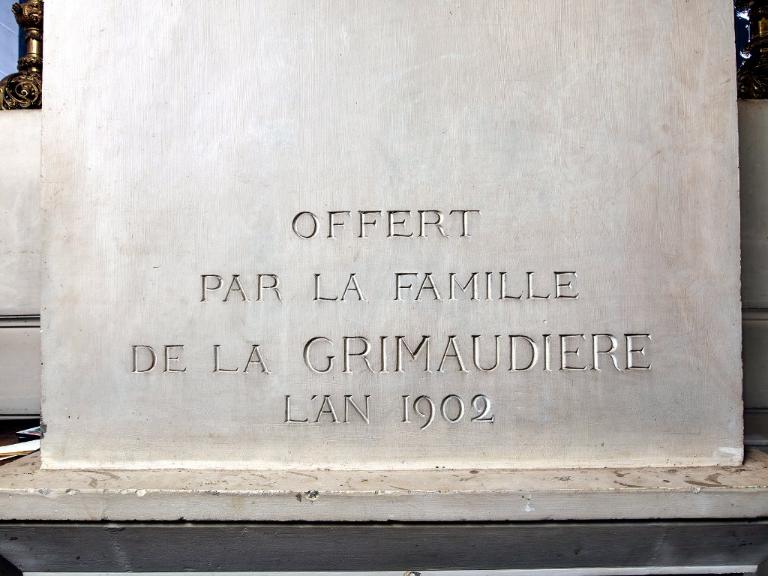 Le maître-autel est offert par la famille de la Grimaudière et bénit le 8 décembre 1902. Sa commande intervient à la fin du chantier de construction de la chapelle.
