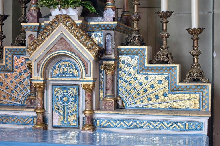L'autel est orné de panneaux de mosaïque dus à Isidore Odorico père (1842-1912) dans les tonalités bleu et or. Des rayons partent de la porte du tabernacle et vont s'épanouir dans le retable, sur un fond semé d'étoiles bleues. Les tons rosés du faux marbre employé pour les écoinçons des arcades et les colonnettes de l'autel et du tabernacle viennent enrichir encore l'aspect et l'impact visuel du meuble.