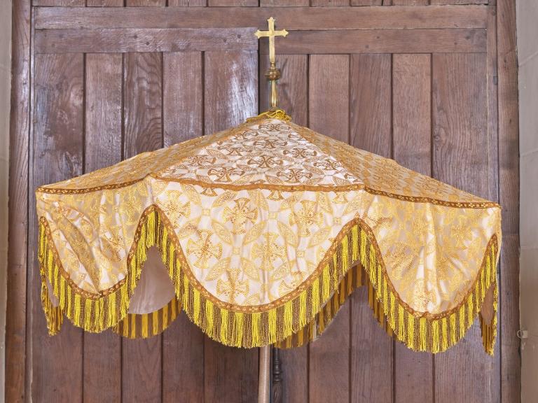 La couleur de ces ombrelles est très codifiée. Si elle est blanche comme ici, elle est destinée au Saint-Sacrement (le doré venant souligner son usage festif). Elle sera blanche ou rouge pour le pape, rouge ou violette pour un cardinal, violette ou verte pour un évêque, parfois bleue pour les autres dignitaires.