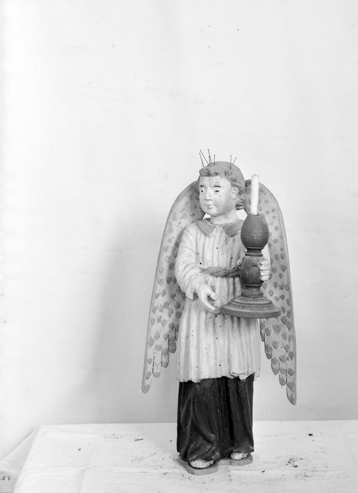 Ailes et bougeoir : statuette transformée en porte-cierge.