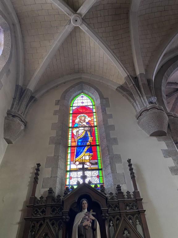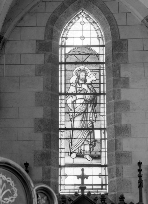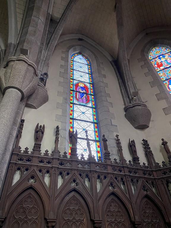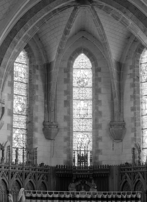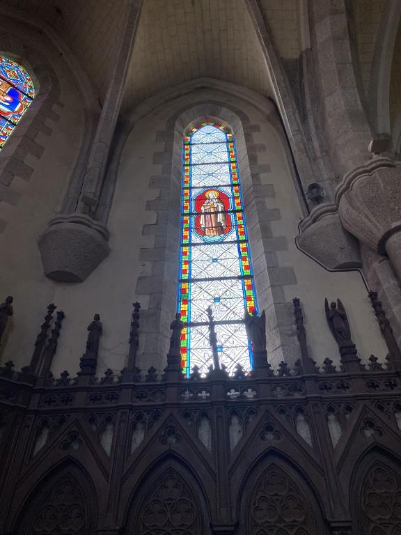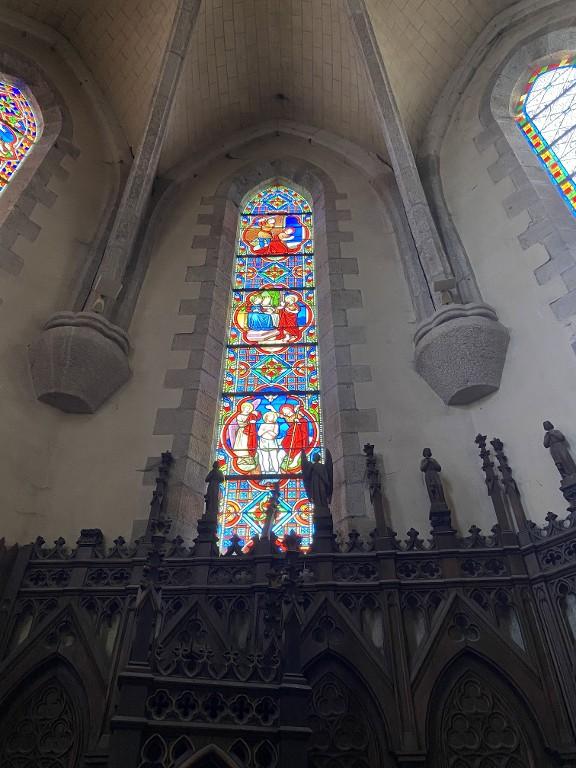 Ensemble de 13 verrières à personnages des baies 0 à 12 : Scènes de la vie et de la Passion du Christ, Saint Louis, Françoise d'Amboise, Vierge à l'Enfant, église paroissiale Notre-Dame (Campénéac)