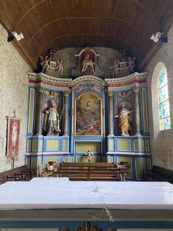 Autel de plan rectangulaire et d'élévation galbée. Retable architecturé à trois travées séparées par des colonnes ; 2 ailes latérales convexes en léger retour et comportant une niche encadrent le tableau central ; les quatre colonnes supportent un entablement à fronton central cintré, surmonté d'un couronnement qui accueille un groupe sculpté ; il est lui-même encadré de deux amortissements occupés par des anges en ronde bosse. Sur l'autel : Agneau mystique et angelots.