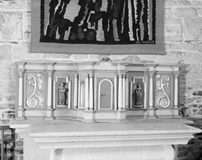 Tabernacle à élévation droite orné de niches et de colonnettes. La niche de gauche abrite la statuette de saint Jean-Baptiste, celle de droite, celle d'un saint abbé, les deux autres sont vides.